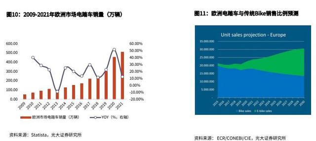 歐洲電踏車預計后續持續高速增長。歐洲電動自行車市場以德國、法國、意大利和荷蘭市場為主導,預計歐洲地區的年均電動自行車購買量將從2019年的370萬輛增長到2030年的1700萬輛,歐洲自行車協會(CONEBI)預計2030年歐洲電動車市場滲透率將突破50%,整體市場增長潛力可期。