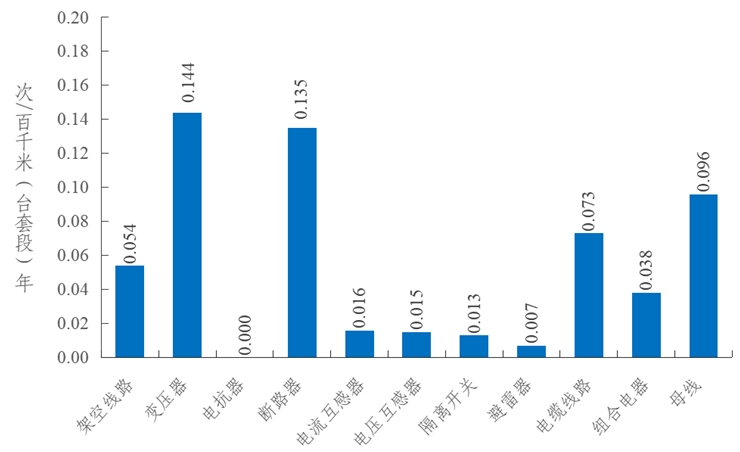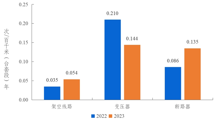 2023年,架空線路的強迫停運率為0.054次/百千米年,同比上升0.019次/百千米年。變壓器的強迫停運率為0.144次/百臺年,同比下降0.066次/百臺年。斷路器的強迫停運率為0.135次/百臺年,同比上升0.049次/百臺年。