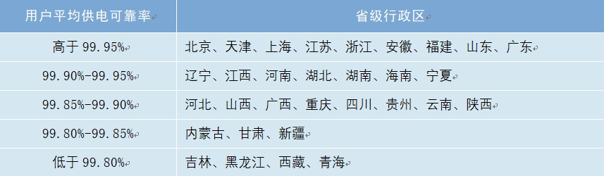 2023年,全國31個省級行政區中,北京、上海、廣東、天津、江蘇、浙江、安徽、福建、山東的用戶平均供電可靠率高于99.95%,內蒙古、吉林、黑龍江、西藏、甘肅、青海、新疆的用戶平均供電可靠率低于99.85%。